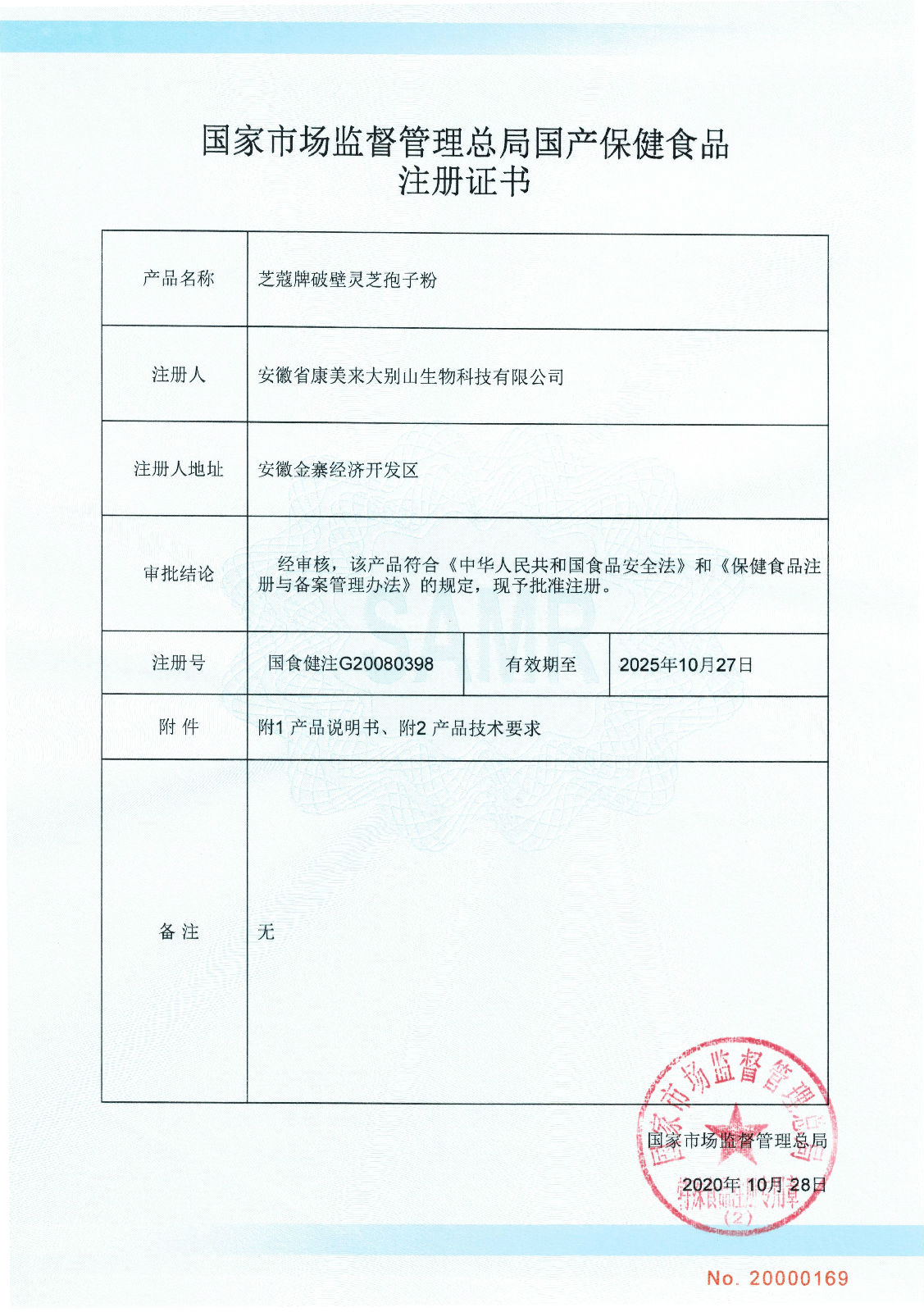 安徽省康美來大別山生物科技有限公司國(guó)產(chǎn)保健食品芝蔻牌破壁靈芝孢子粉,于2020年10月28日通過國(guó)家市場(chǎng)監(jiān)督管理總局批準(zhǔn)再審注冊(cè),注冊(cè)號(hào):國(guó)食健注G20080398,現(xiàn)予告知。