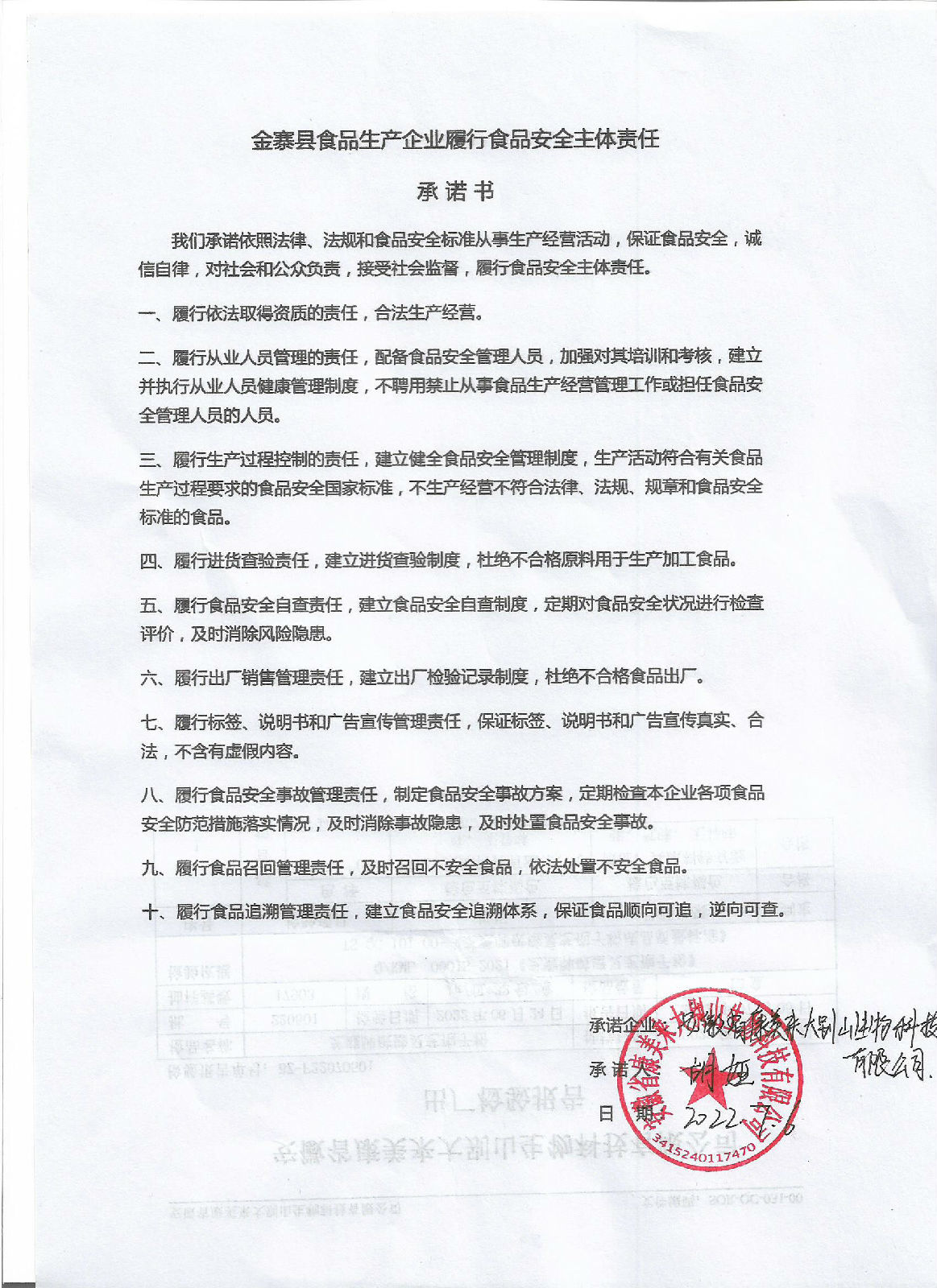 金寨縣食品生產企業履行食品安全主體責任承諾書