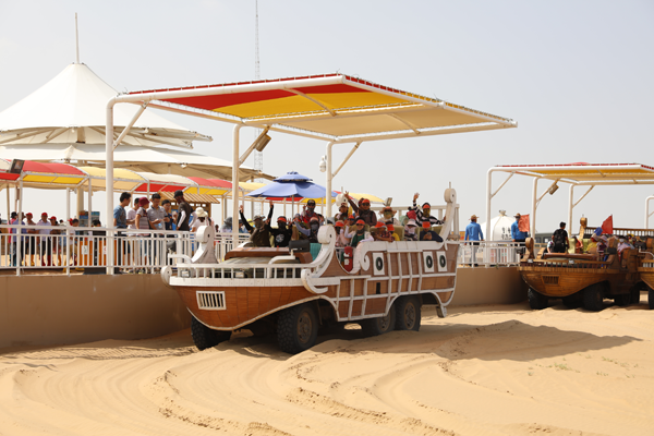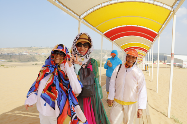 2日上午,大家一同抵達(dá)了“世界罕見(jiàn),中國(guó)之最”的銀肯響沙灣,它就像一根掛在黃河上的弦,金黃色的沙坡浩瀚無(wú)際,在藍(lán)天白云下又好似一條金黃色的臥龍,風(fēng)一吹,沙子如水流動(dòng),沙沙作響,像一曲激昂澎湃的交響樂(lè)。索道、穿沙襪、沙漠沖浪車(chē)、滑沙、騎駱駝、高空滑索......妙趣橫生,大家玩得流連忘返!