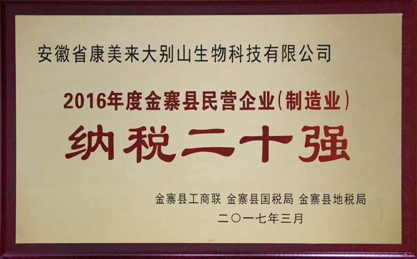 會議表彰安徽省康美來大別山生物科技有限公司“2016年度金寨縣民營企業納稅20強”并授牌。