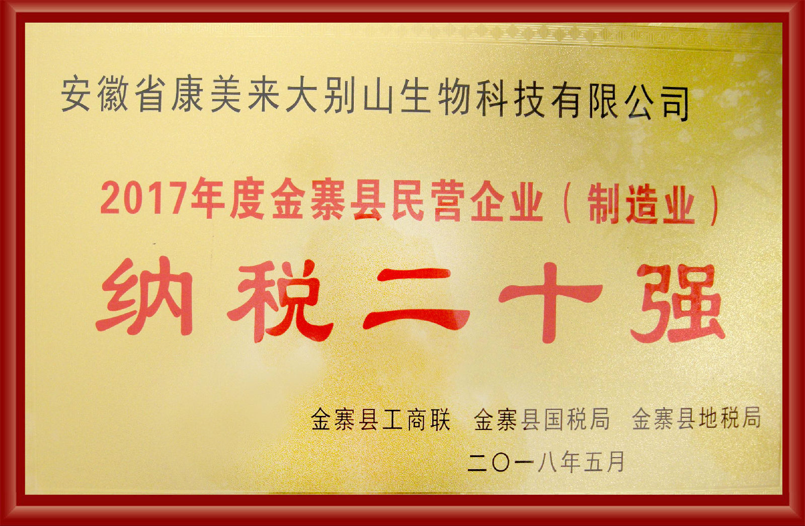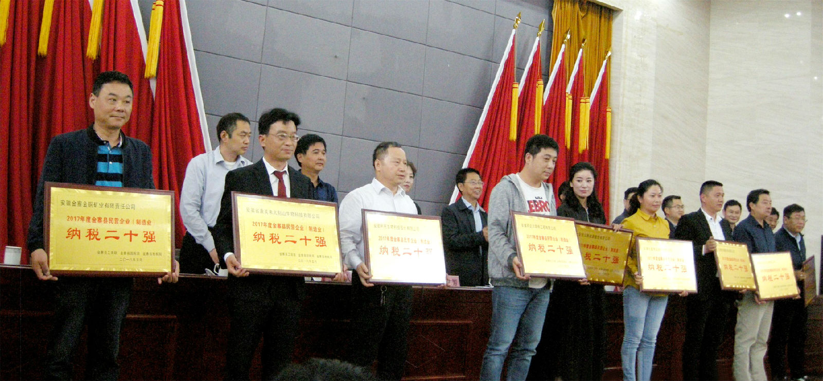 會議公布了金寨縣企業(yè)2017年度納稅排序活動結果,對納稅二十強企業(yè)進行了表彰頒獎,授予康美來“2017年度金寨縣民營企業(yè)(制造業(yè))納稅二十強”稱號,公司總裁助理尹維龍參會并上臺領獎。此獎項為康美來連續(xù)三年來納稅排序持續(xù)向前移位,且排序靠前。