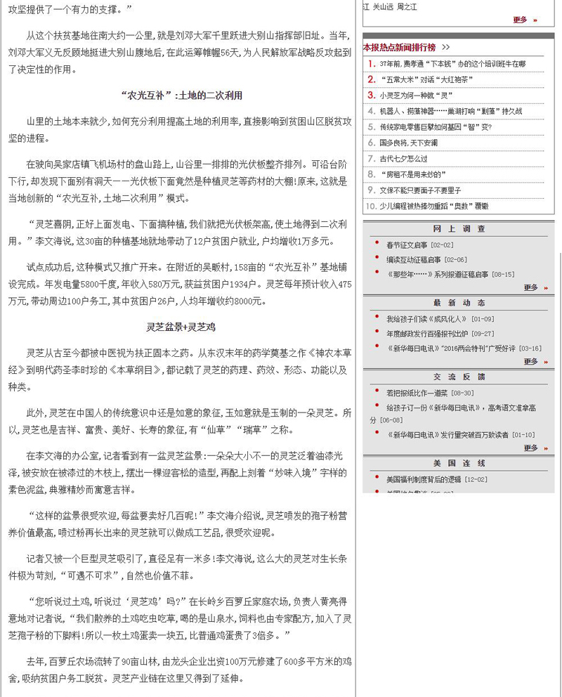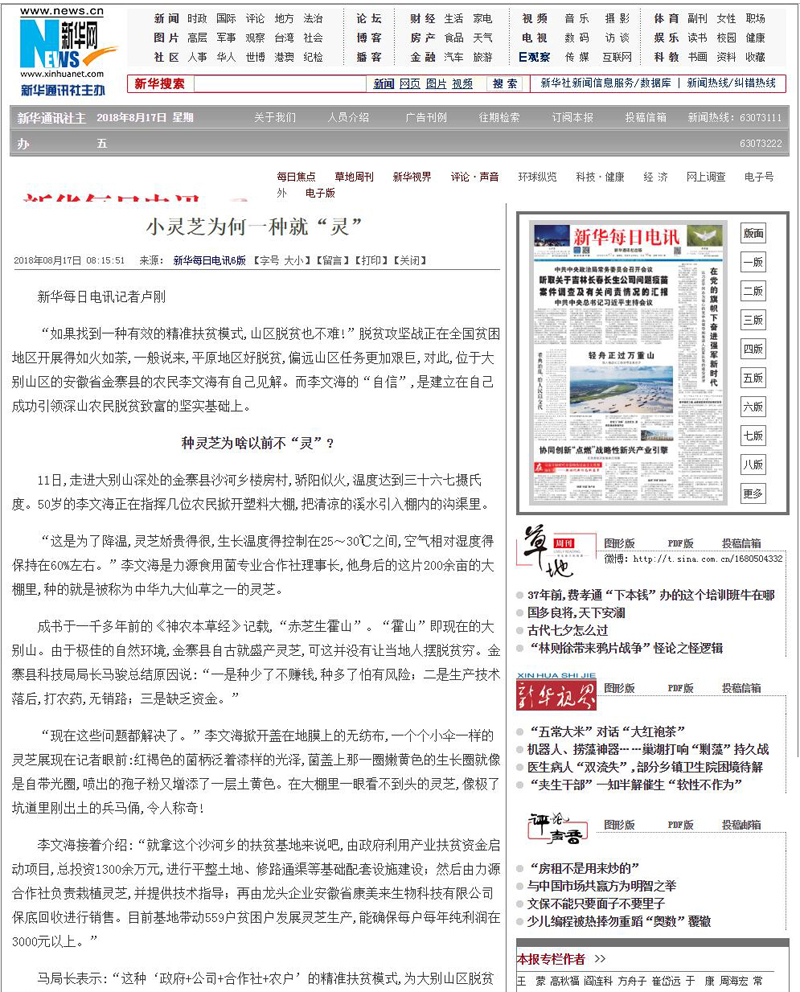 8月17日,新華社旗下平面報紙《新華每日電訊》主版刊發(fā)“小靈芝為何一種就靈”的記者文章,報道康美來公司大別山靈芝基地產(chǎn)業(yè)精準(zhǔn)扶貧模式。
