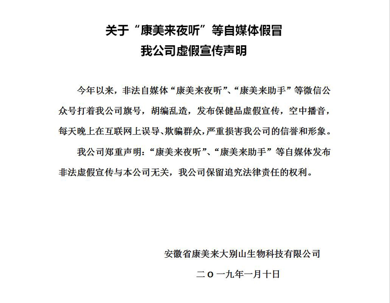關于“康美來夜聽”等自媒體假冒我公司虛假宣傳聲明