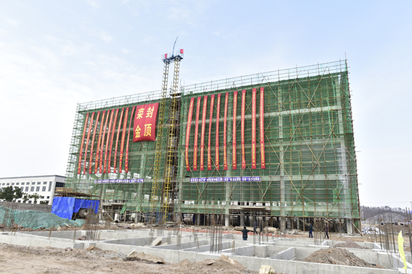 余董重點察看霍山石斛保健品加工車間廠房。目前已建4層,墻上掛滿了封頂大吉的慶賀條幅。