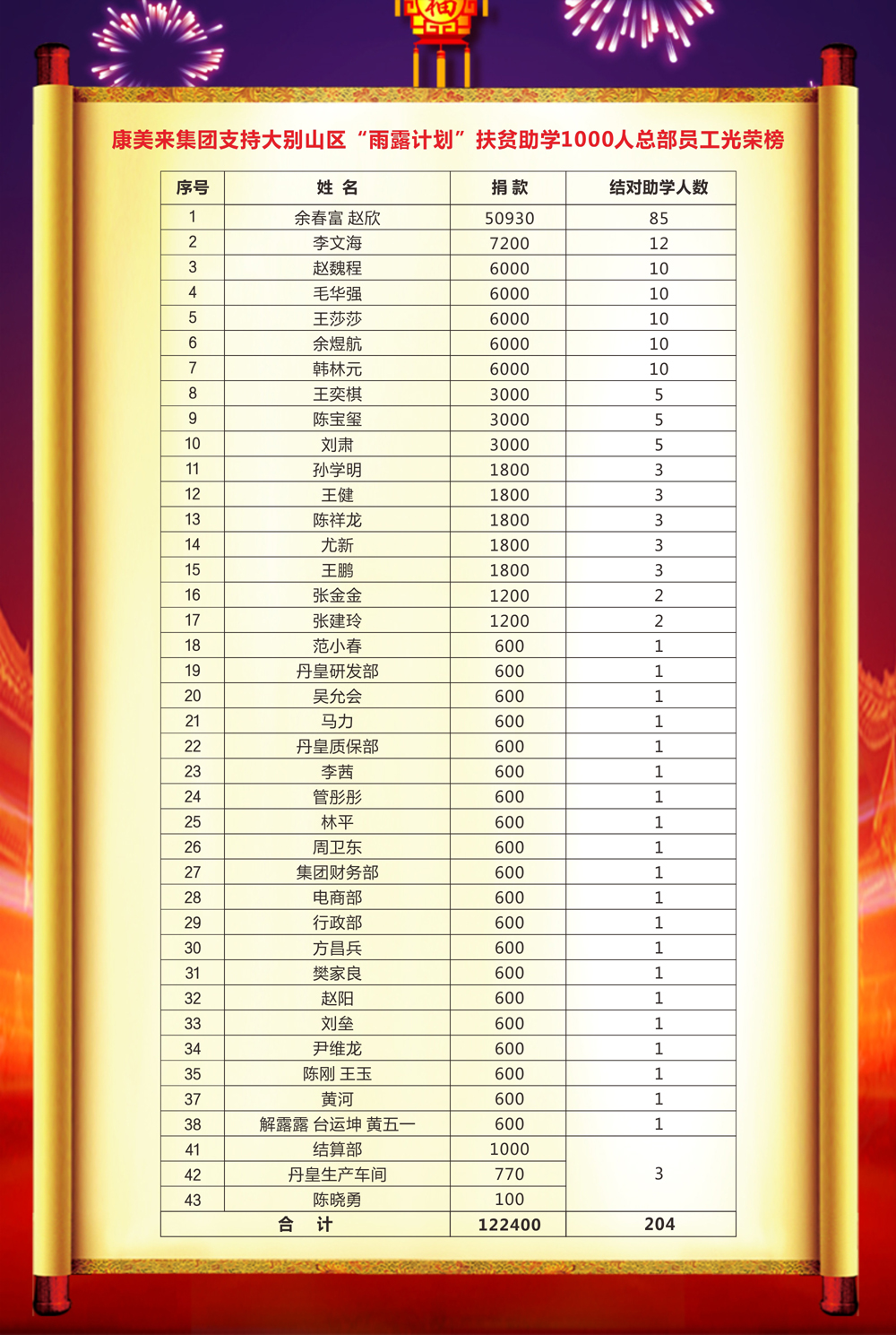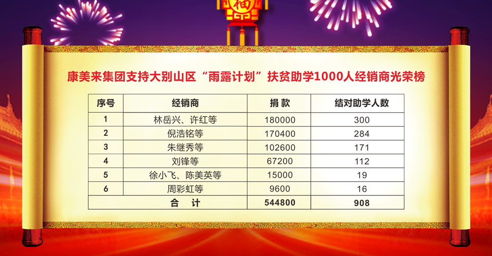 康美來集團(tuán)廣大經(jīng)銷商和干部職工支持金寨縣政府“雨露計(jì)劃”2019年度實(shí)施扶貧助學(xué)結(jié)對(duì)大別山區(qū)貧困學(xué)生1000人行動(dòng),實(shí)際達(dá)成結(jié)對(duì)1112人,總捐款667200元。現(xiàn)發(fā)布光榮榜,予以表揚(yáng)。