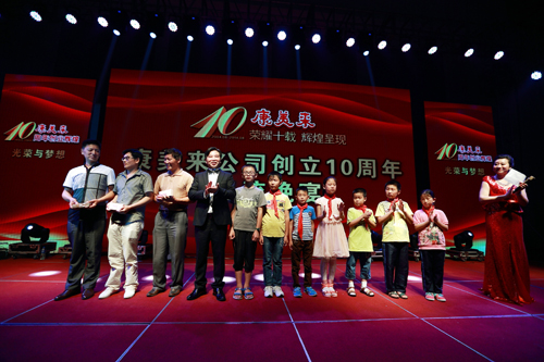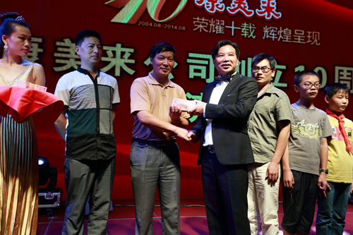 2014年8月,在康美來公司10周年創(chuàng)業(yè)輝煌晚會上,余春賦董事長把110400元現(xiàn)金現(xiàn)場捐助給金寨縣沙河鄉(xiāng)中心小學、燕子河鎮(zhèn)樹林小學、青山鎮(zhèn)姜河中心小學184名貧困學生,支持政府雨露計劃。公司自2014年起,發(fā)動公司干部和伙伴開展結對扶貧助學,奉獻愛心,回饋社會。2014年由過去的117名,增加到184名學生,由2所小學增加到3所小學。扶貧辦主任劉澤祥參加捐助活動并講話。
