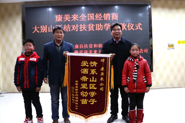 捐助儀式上,燕子河樹林小學的師生代表為康美來公司贈送了“情系山區學子,愛灑希望幼苗”的錦旗。