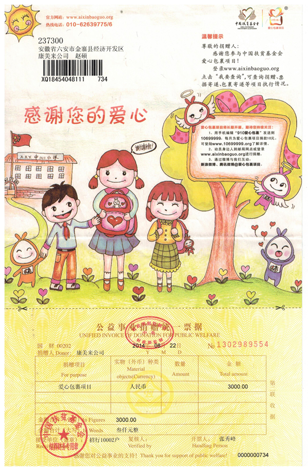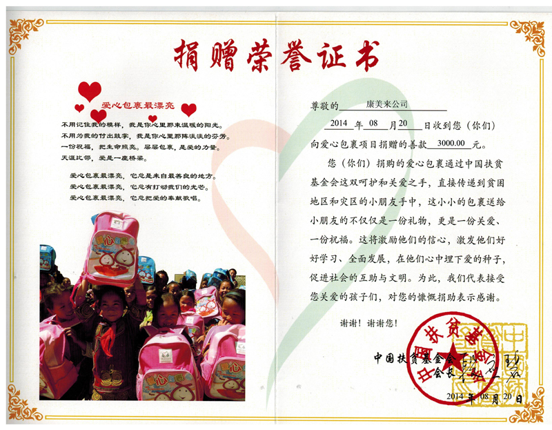 為了幫助貧困地區的小學生能夠順利上學,緩解學生家庭的生活壓力,2014年8月,康美來公司積極參加中國扶貧基金會發起的全民公益活動,組織了愛心包裹溫暖行動,踴躍捐款3000元。